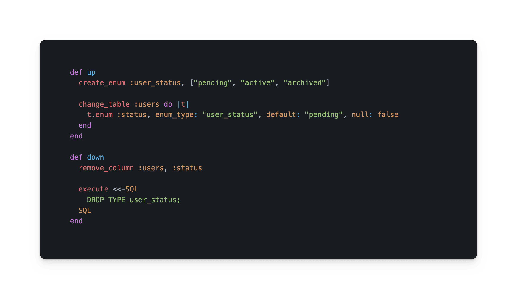 Rails 7 introduced a new way to create enums in PostgreSQL, by adding create_enum method. See official documentation here. I will explore the following tasks: Creating an enum type and adding a column to a model with that enum type How to add a new ...