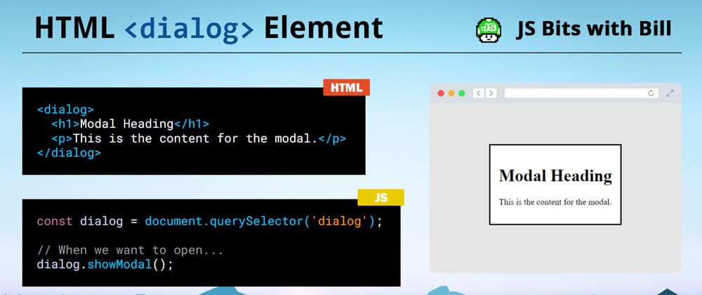 HTML's <dialog> element is a built-in tag to represent a dialog box or modal. It's not just a newer semantic element, it also includes an API and its own special CSS.