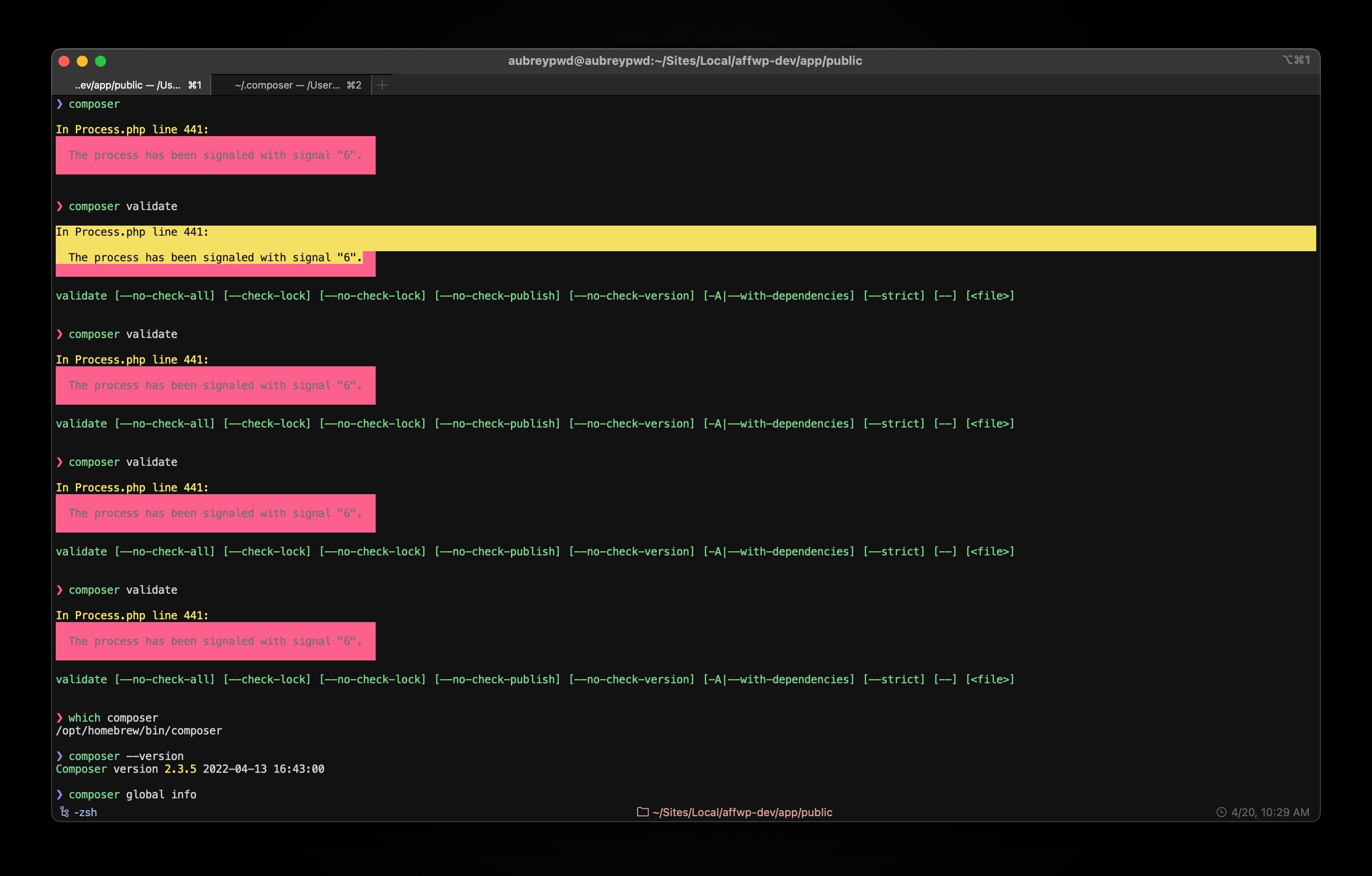 In Process.php line 441: The process has been signaled with signal "6" when running composer on Mac
