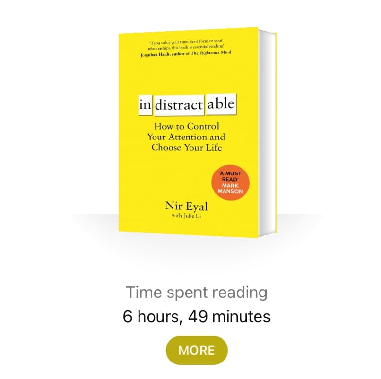 斯坦福消费心理学老师Nir Eyal的书《不可打扰》(Indistactable)这周读完了,总耗时7小时。感觉还行,不如《Make Time》和《Digital Minimalism》,但也有一些启发,比如对于日历的重度使用。 Nir认为现代人易受干扰,有内在和外在的因素,除了针对这两种trigger进行行为优化之外,还应该为那些“traction”(不应该被打扰的事项)规划出时间。 https://youtu.be/dqN050xeChY 其中有一章是关于培养孩子的不受干扰能力的,讲到几点很...