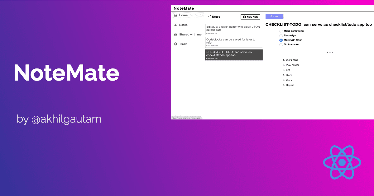 Highlights Supports codeblocks & html Notion like WYSIWYG editor(courtesy Editor.js) Can be used as todo/checklist Motivation There are a lot of note-taking applications but do we ever add confidential notes to it? The answer is simply no. T...
