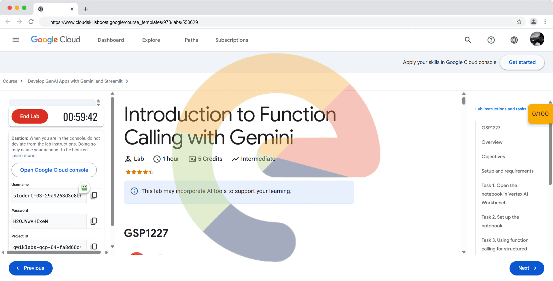 Overview Gemini is a family of generative AI models developed by Google DeepMind that is designed for multimodal use cases. The Gemini API gives you access to the Gemini Pro Vision and Gemini Pro models. In this lab, you learn how to use the Vertex A...