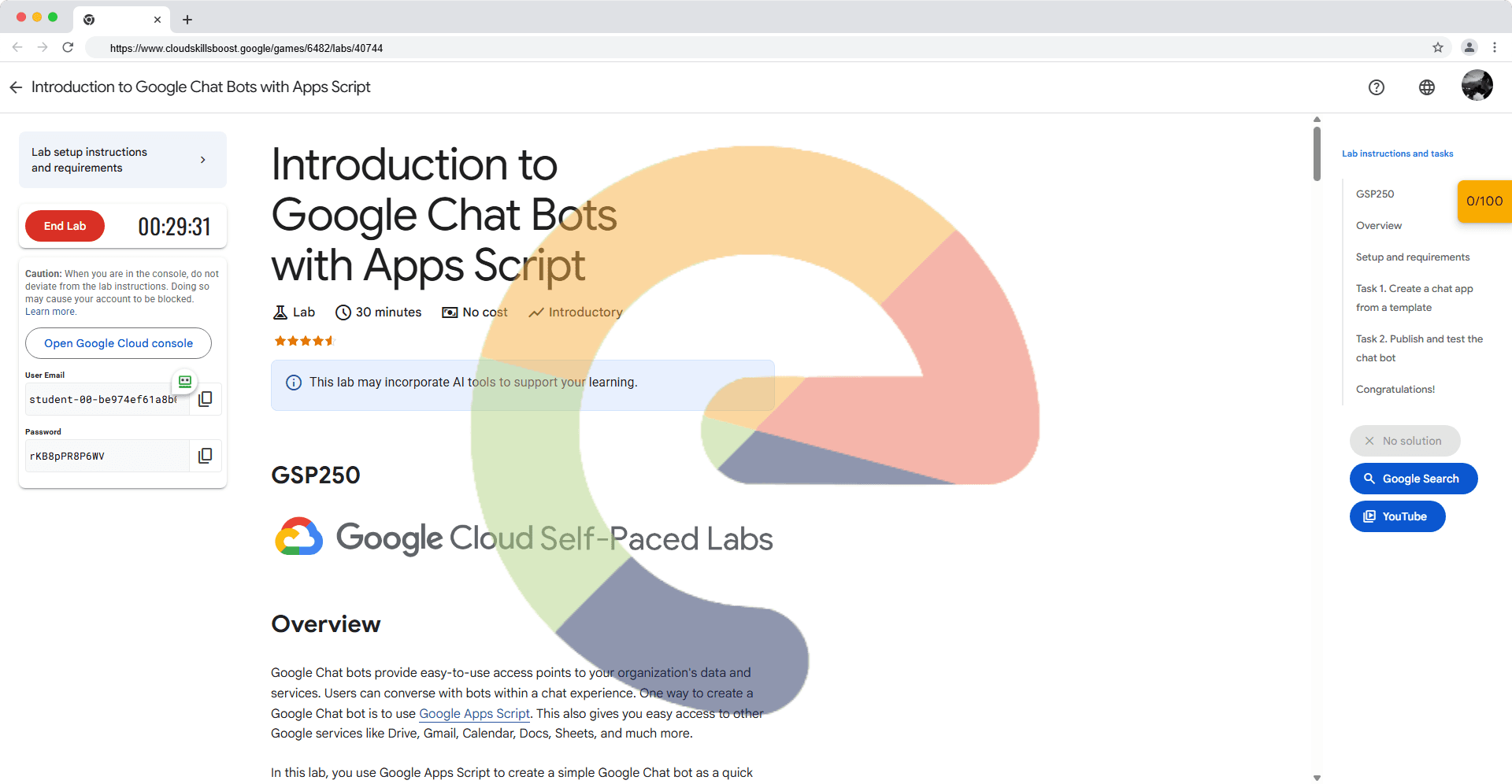 Overview Google Chat bots provide easy-to-use access points to your organization's data and services. Users can converse with bots within a chat experience. One way to create a Google Chat bot is to use Google Apps Script. This also gives you easy ac...