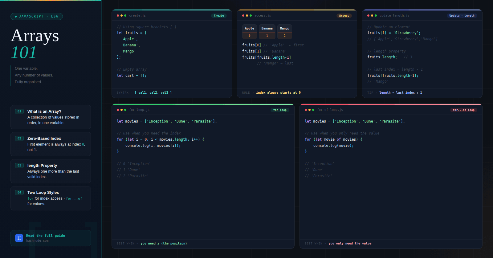 Imagine you need to store the names of your 5 favourite movies. You could do it like this: let movie1 = "Inception"; let movie2 = "Interstellar"; let movie3 = "The Dark Knight"; let movie4 = "Parasite