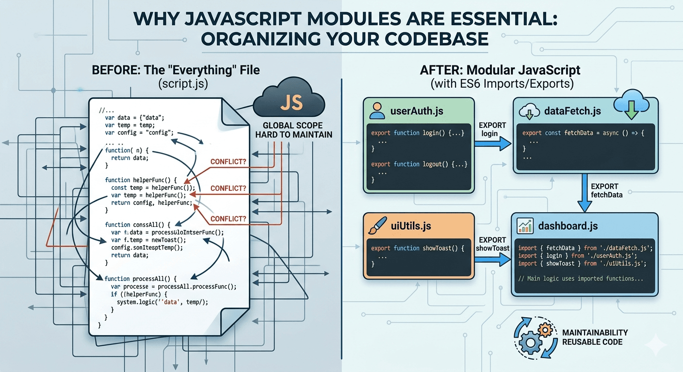Just as Template Literals (as we know) replaced messy plus signs with clean placeholders, JavaScript Modules replace one giant, unmanageable file with small, organized "bricks" of code. If we keep all