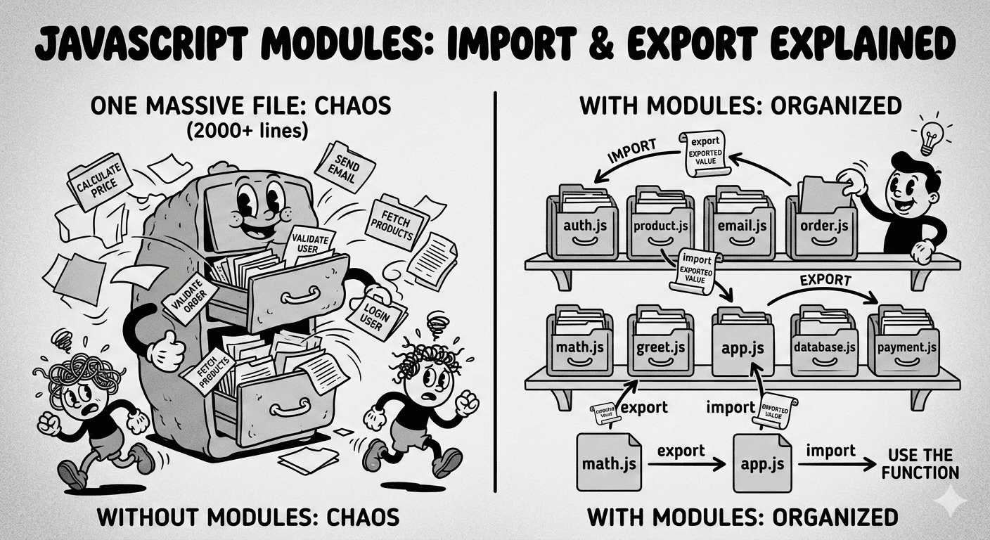 JavaScript Modules: Import and Export Explained (A Beginner-Friendly Story) Let me start with a small story. Imagine a small kitchen. One person is cooking, another is chopping vegetables, someone els