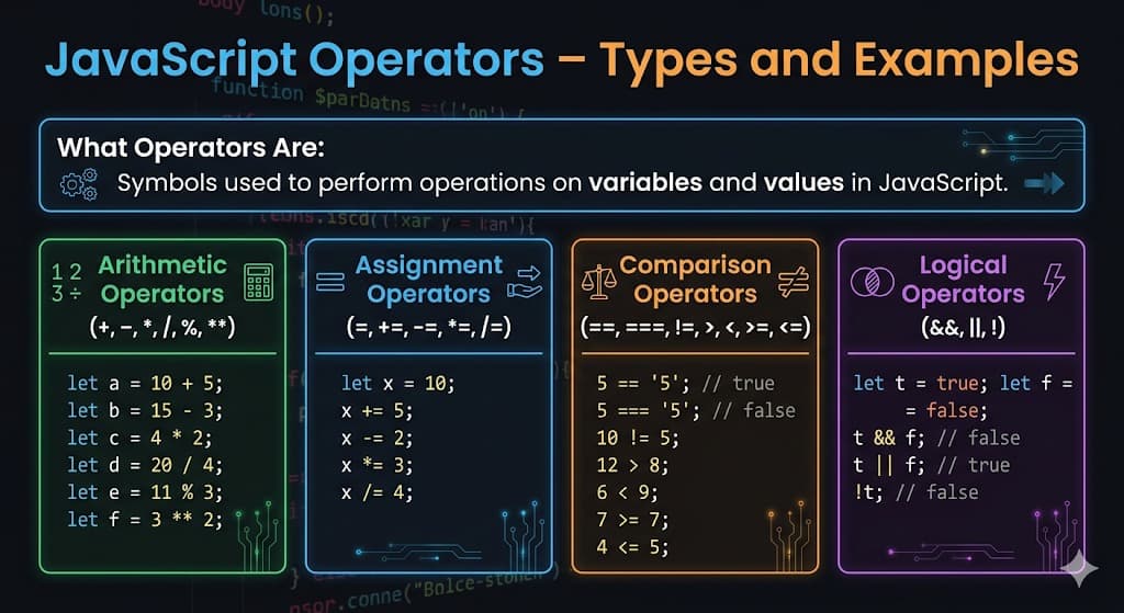 What operators are in JS ? In JavaScript there are several types of operators to perform operations on values and variables such as, mathematical operations, comparison and logical operations. Types o