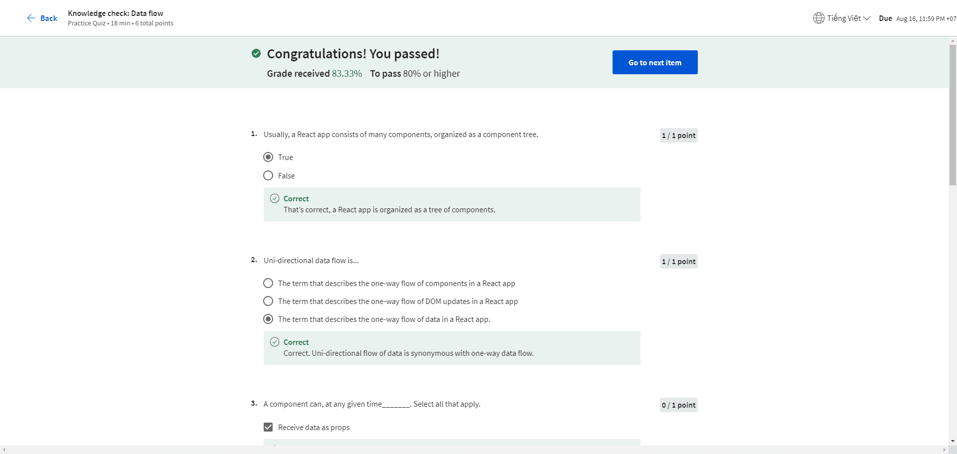 Usually, a React app consists of many components, organized as a component tree. True False Uni-directional data flow is... The term that describes the one-way flow of components in a React app The term that describes the one-way flow of DOM u...