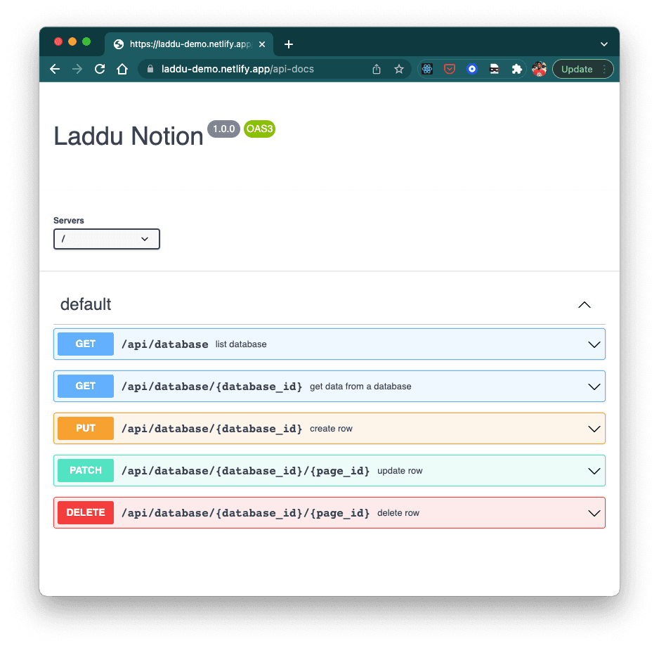 Deploy a quick CRUD API service and Swagger API playground for your notion database. Good for building internal dashboards, mock api servers, 3rd party webhook integrations. Project is named after my cat "Laddu" π