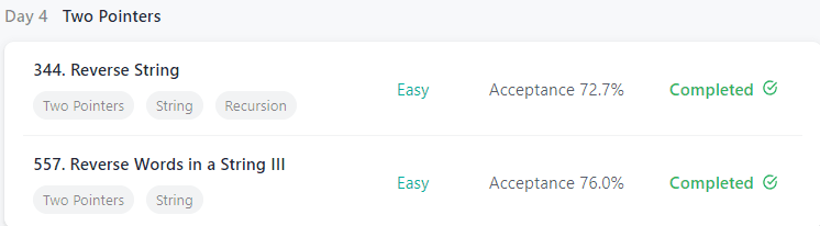 Day 4 Two Pointers 344. Reverse String Problem: Write a function that reverses a string. The input string is given as an array of characters s. You must do this by modifying the input array in-place with O(1) extra memory. I will approach this pro...