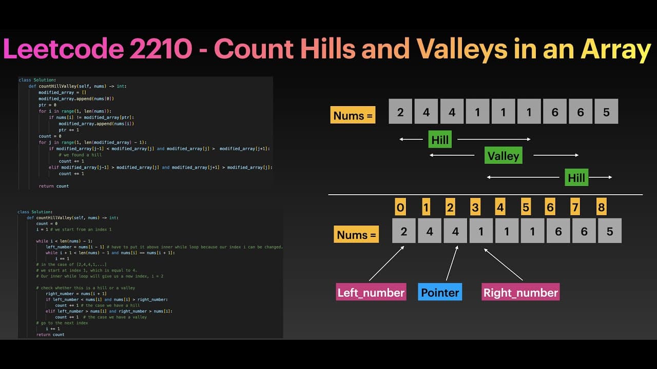 Problem Description LeetCode 2210 asks us to count the number of hills and valleys in an array. A hill is an element that is strictly greater than its neighbors, while a valley is an element that is strictly smaller than its neighbors. The key challe...
