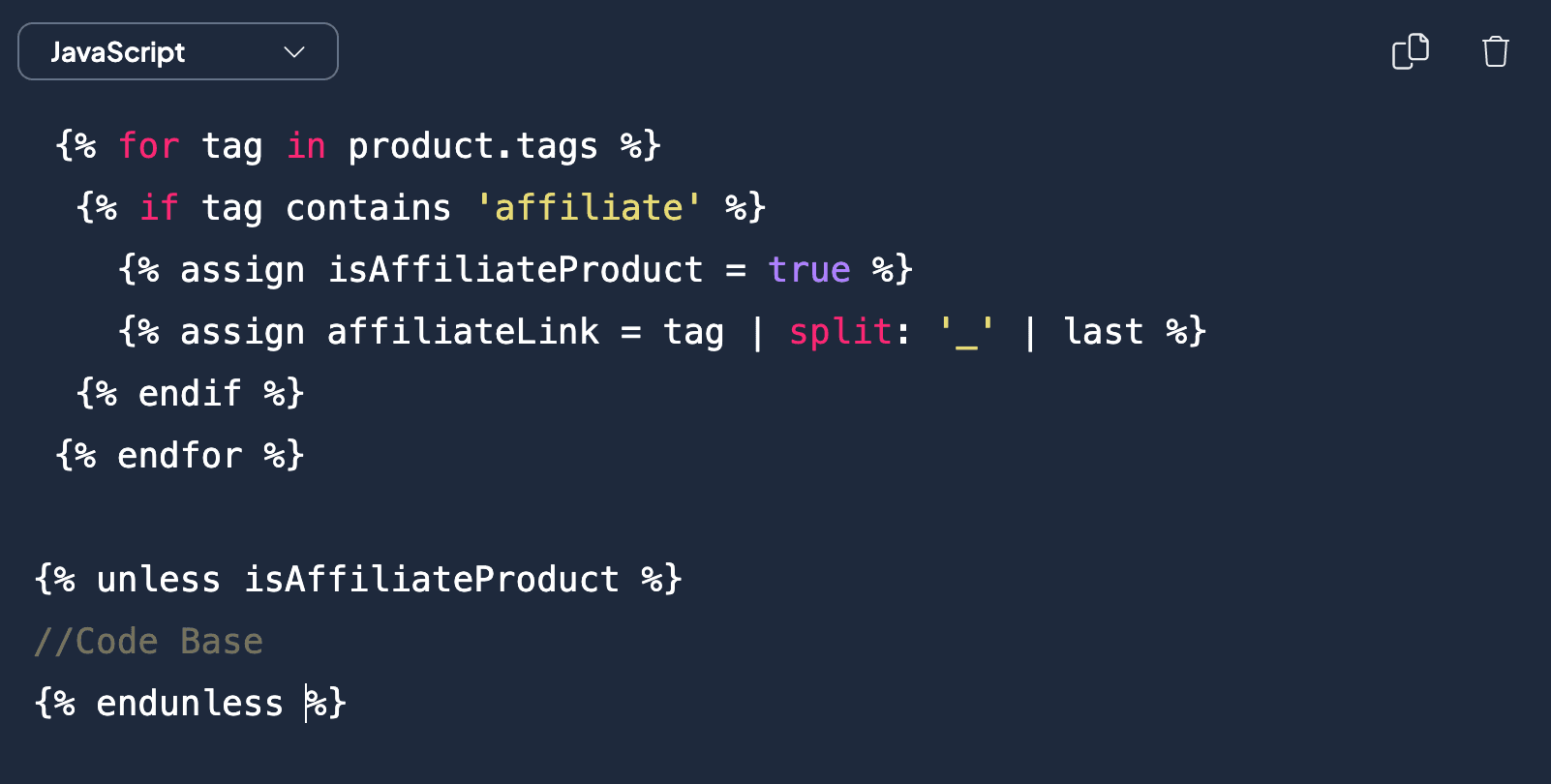 {% for tag in product.tags %} {% if tag contains 'affiliate' %} {% assign isAffiliateProduct = true %} {% assign affiliateLink = tag | split: '_' | last %} {% endif %} {% endfor %} {% unless isAffiliateProduct %} //Code Base {% endunles...