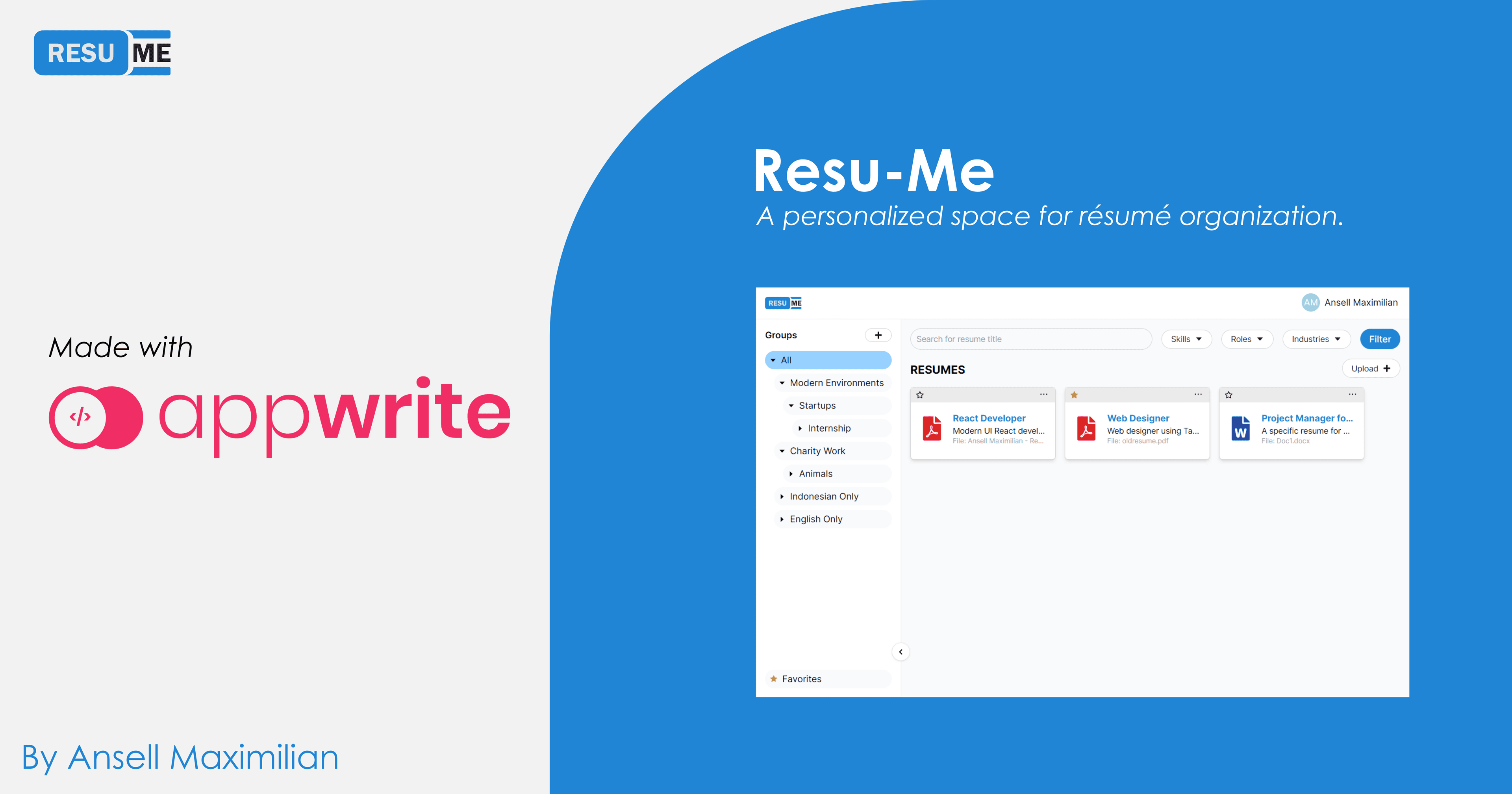 [Resu-Me]: Appwrite Hashnode Hackathon Team Details Ansell Maximilian - @ansellmax Description of Project Resu-Me is a file management web application meant specifically for organizing your résumés. This app will help you manage your résumés so tha...