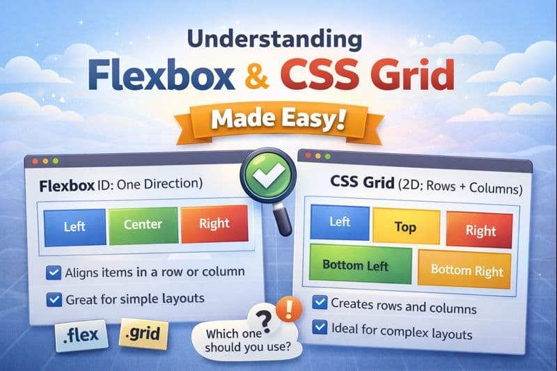 4 🧩 Understanding Flexbox & CSS Grid (Beginner-Friendly Guide) Ever tried to align items in CSS and thought“Why is this so hard?” 😵Same here!Let’s learn Flexbox and Grid in the simplest way possible 😊 👋 Introduction Hi everyone 👋This is anoth...