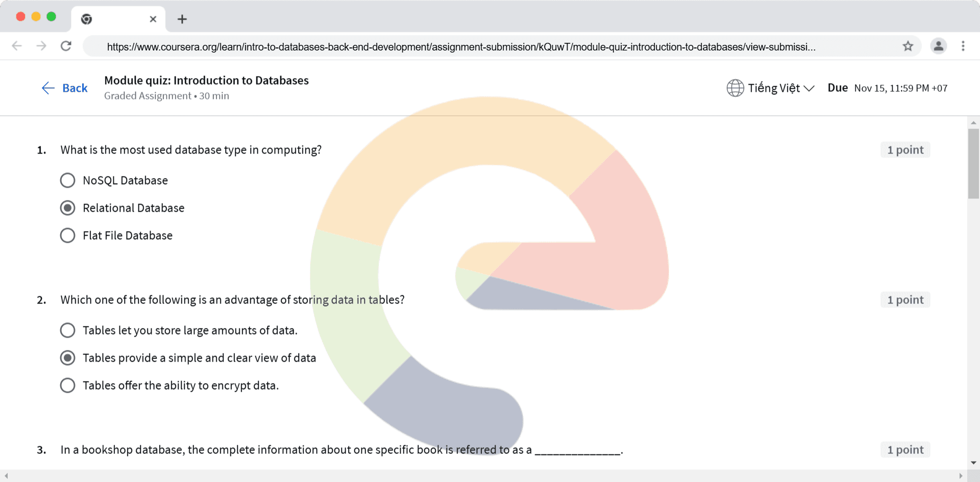 What is the most used database type in computing? NoSQL Database Relational Database Flat File Database Which one of the following is an advantage of storing data in tables? Tables let you store large amounts of data. Tables provide a simple ...