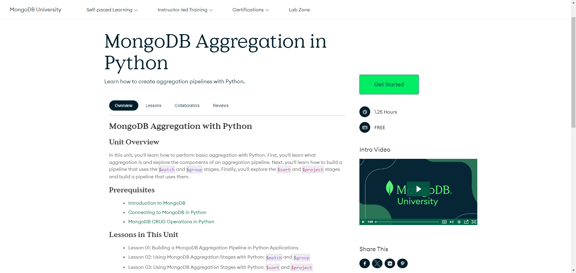 Overview In this unit, you'll learn how to perform basic aggregation with Python. First, you'll learn what aggregation is and explore the components of an aggregation pipeline. Next, you'll learn how to build a pipeline that uses the $match and $grou...