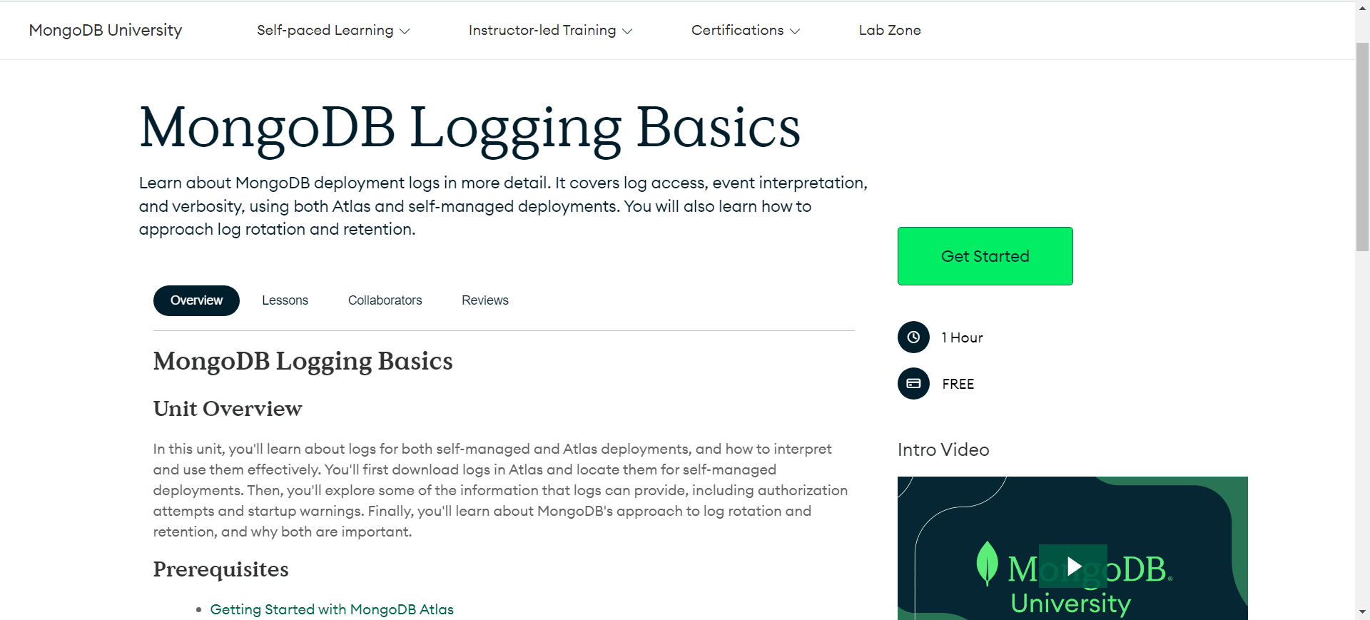 Overview In this unit, you'll learn about logs for both self-managed and Atlas deployments, and how to interpret and use them effectively. You'll first download logs in Atlas and locate them for self-managed deployments. Then, you'll explore some of ...