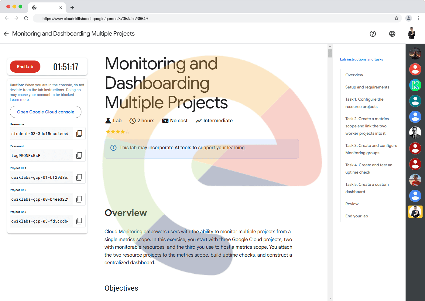 Overview Cloud Monitoring empowers users with the ability to monitor multiple projects from a single metrics scope. In this exercise, you start with three Google Cloud projects, two with monitorable resources, and the third you use to host a metrics ...