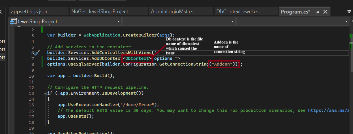 There was an error in the terminal I encountered when I was migrating my first file it happened because my file name dbcontext is DbContextJewel and in program.cs I've called the dbcontext file with name of dbcontext instead of DbContextJewel Error :...
