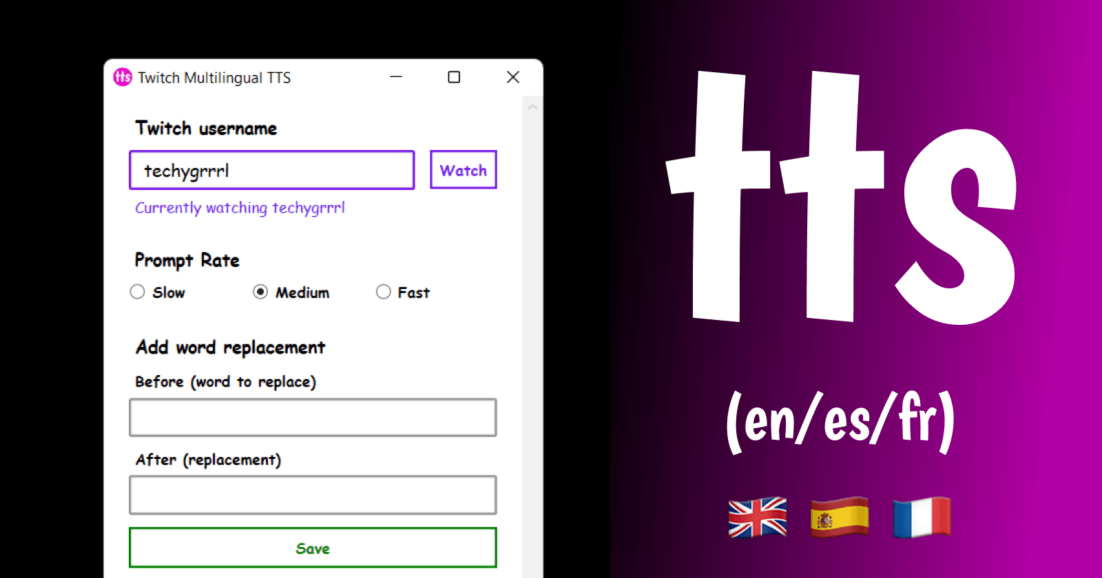 Multilingual Text-to-Speech (TTS) app for Twitch on Windows