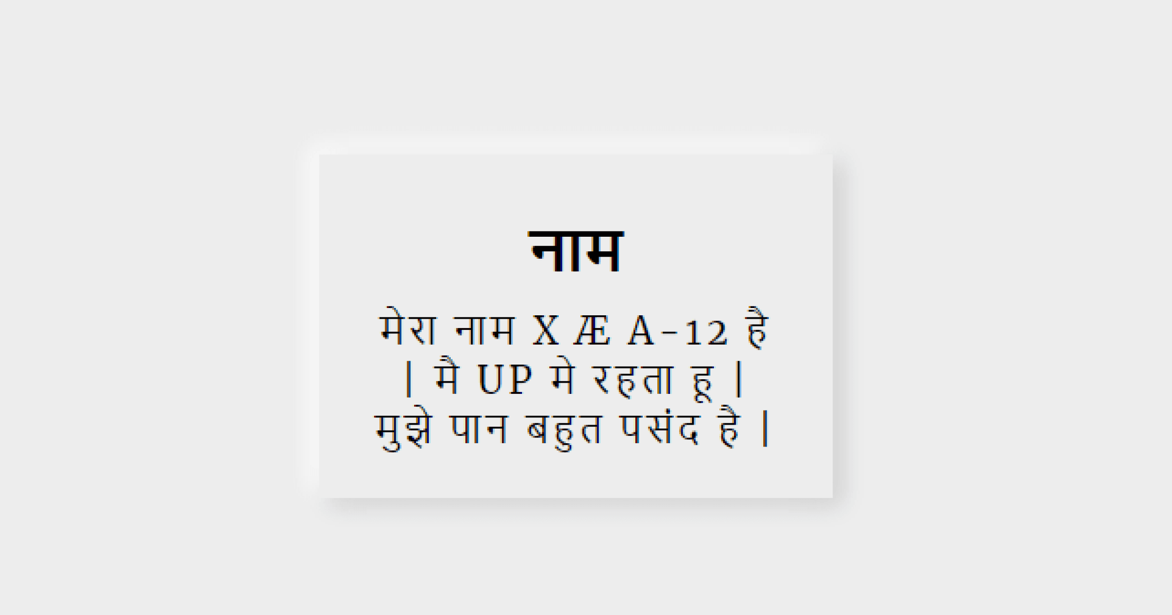 Not gonna mention how neumorphic design works, I'll jump straight into the main code: <!-- This is an example card template in html --> <div class="parent"> <div class="card"> <h2>नाम </h2> <p>मेरा नाम X Æ A-12 है | मै UP मे रहता हू | मु...