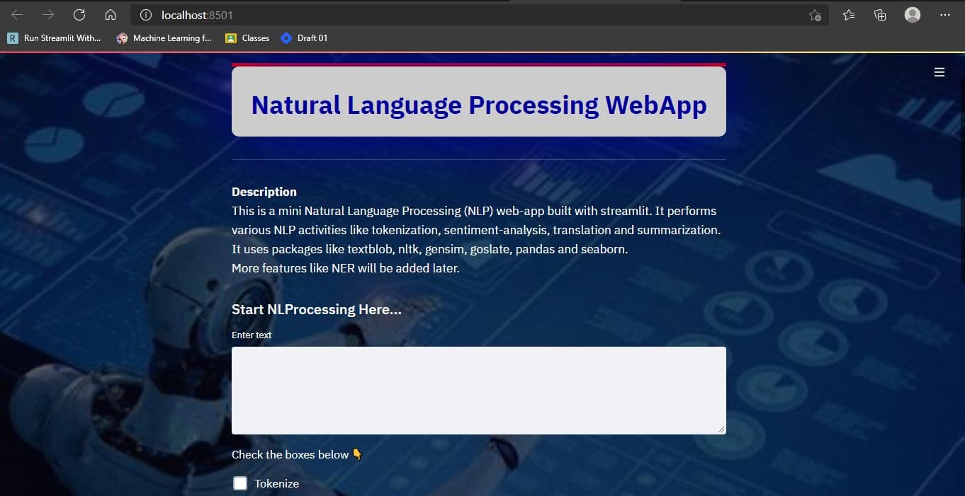 This simple Natural Language Processing web-app can be built in few minutes and with few lines of codes using Streamlit. The app can be used to perform NLP task like tokenization, translation, summarization, n-gram, et cetera.