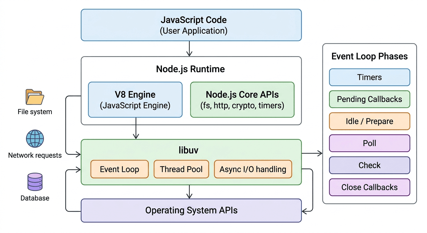 Node.js runs your JavaScript code on a single main thread using Google’s V8 engine, but it can still handle many operations concurrently by offloading work to the operating system and a built-in threa