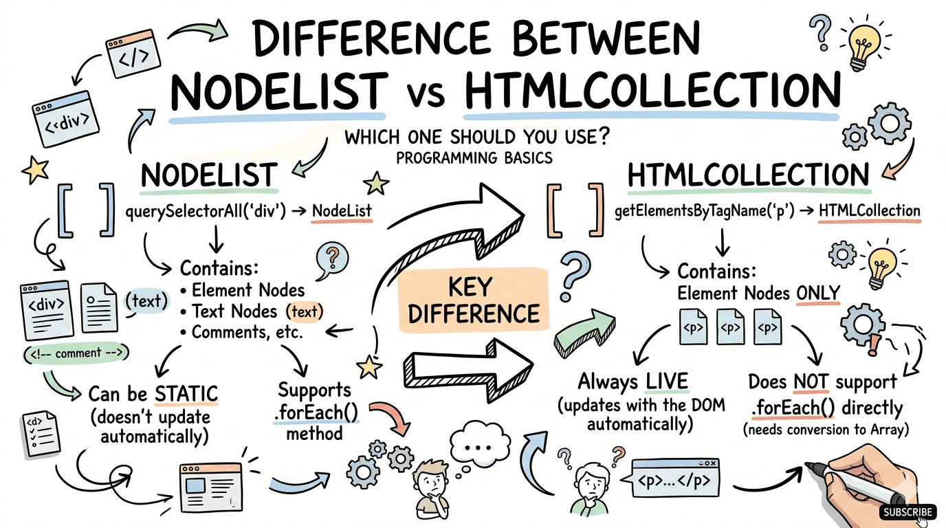 What is a NodeList? A NodeList is a collection (list) of DOM nodes.In simple words:When the browser reads HTML, it treats everything as a node (elements, text, comments).A NodeList is just a group of
