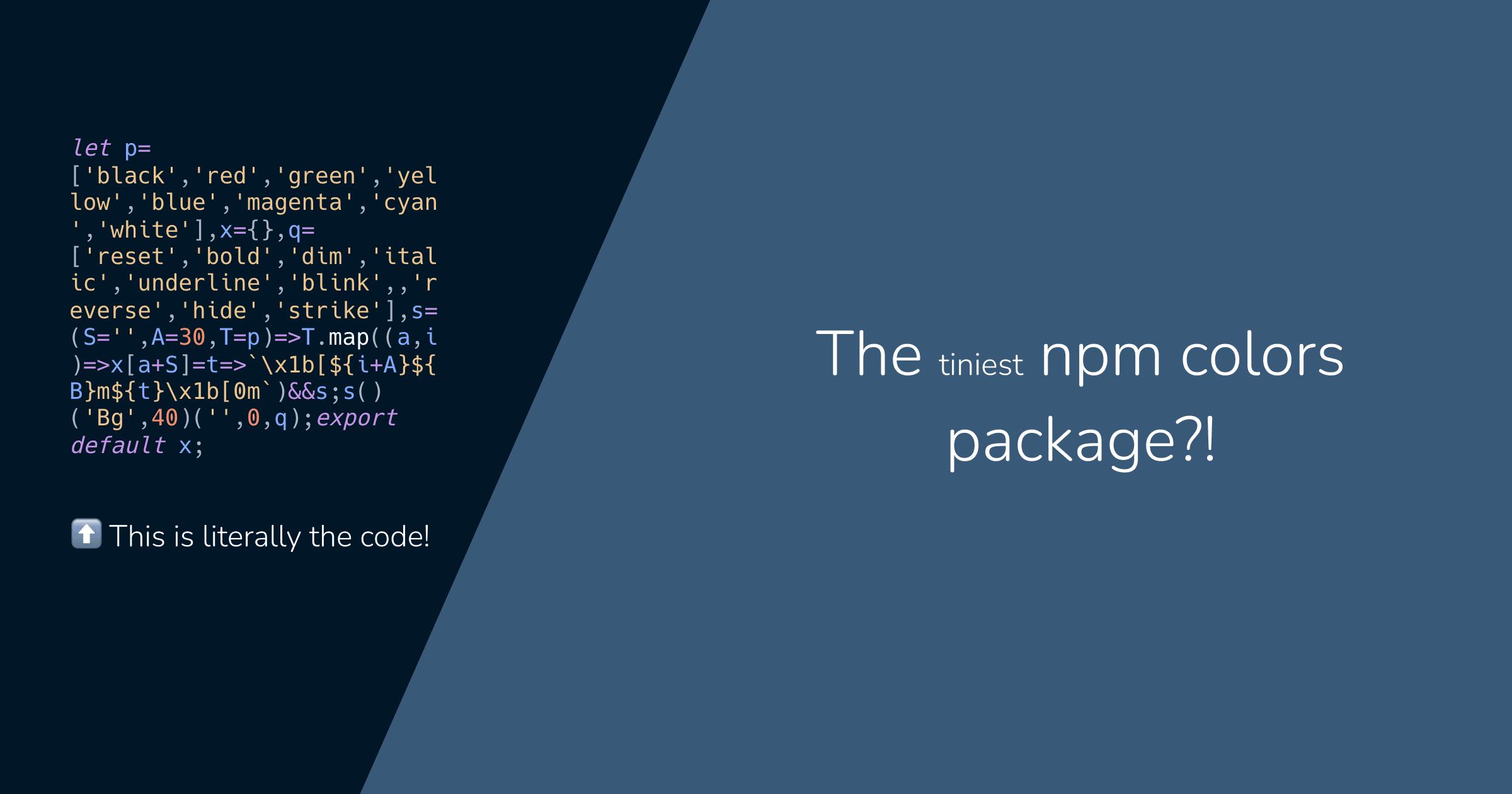 A few minutes ago, I published PlanckColors. It's probably the smallest node module for colors on the internet, at just 119 bytes minzipped! It's so small, here's the source code: