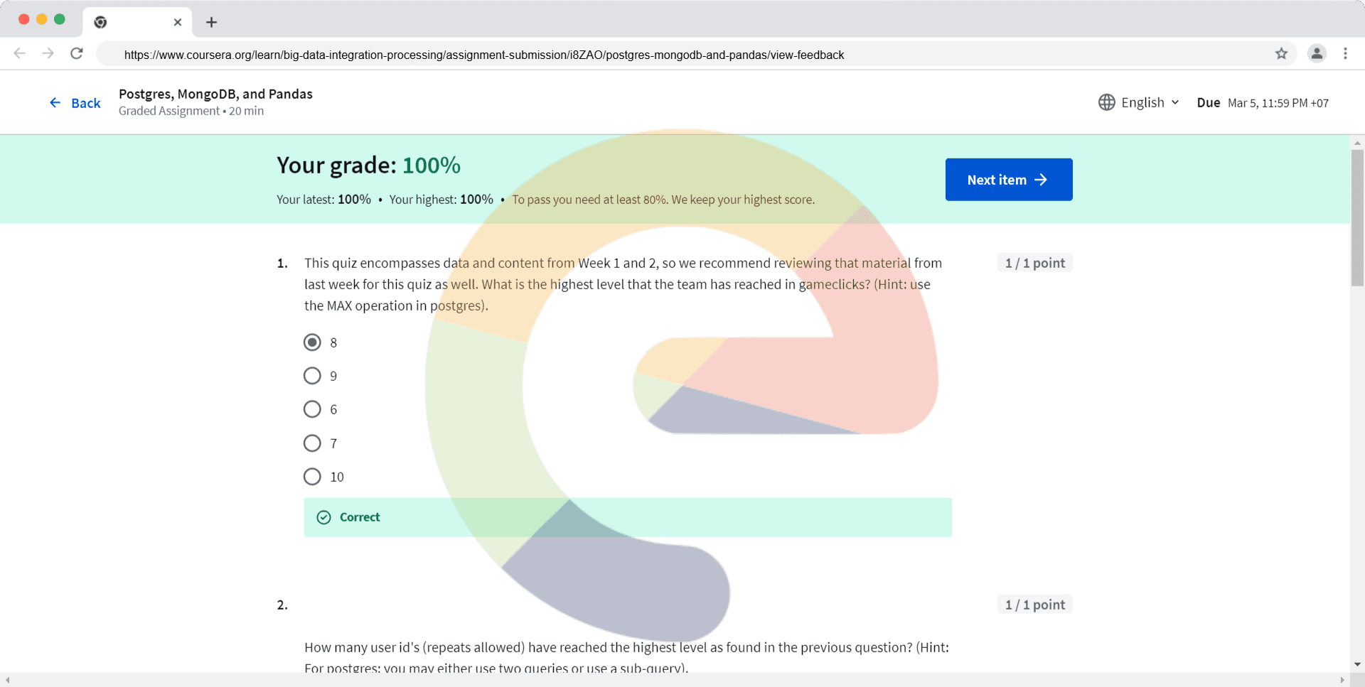 This quiz encompasses data and content from Week 1 and 2, so we recommend reviewing that material from last week for this quiz as well. What is the highest level that the team has reached in gameclicks? (Hint: use the MAX operation in postgres). 8 ...