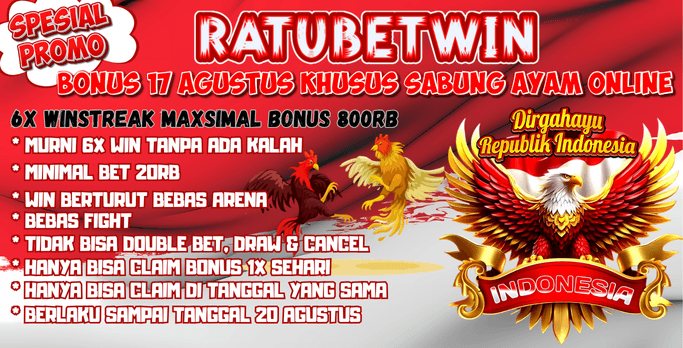 Dalam rangga menyambut 17 Agustus 2025, situs RATUBETWIN akan mengadakan promo bonus untuk memeriahkan hari kemerdekaan Indonesia bosku.Yuk ikuti Promo Bonus 17 Agustus Khusus Sabung Ayam Online Ratubetwin yg berlaku sampai tanggal 20 Agustus 2025 bo...