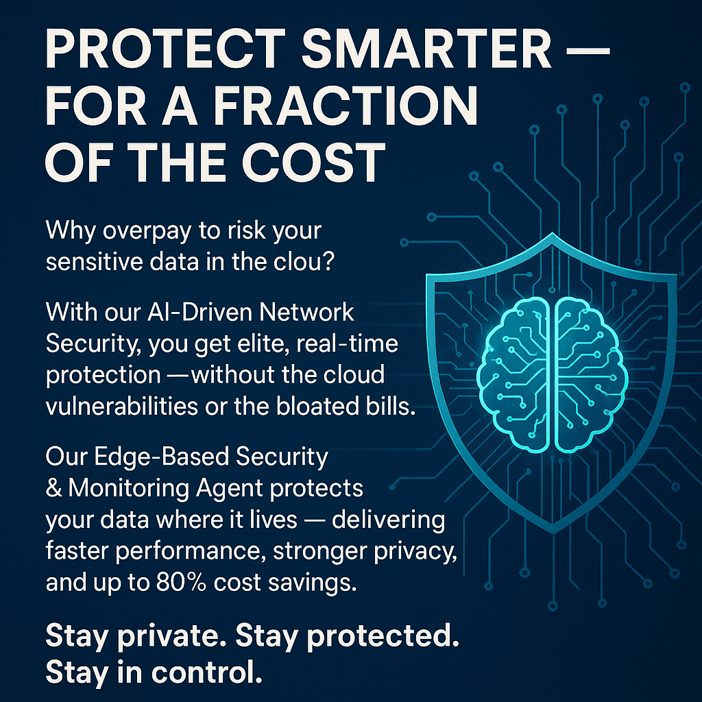 With our AI-Enabled Network Security, you get elite, real-time protection — without cloud risks, without cloud bills. Our Edge-Based Security & Monitoring Agent defends your critical data right where it lives — keeping it faster, safer, and 80% more ...