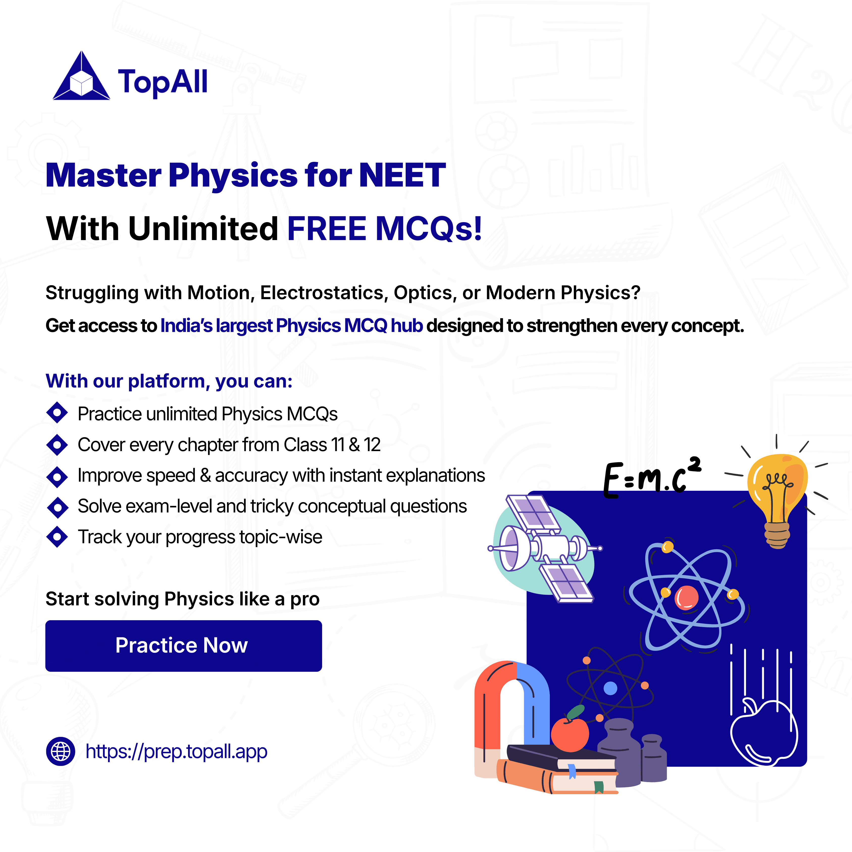 Push, pull, friction, inertia Laws of Motion becomes super easy when you practice For NEET With unlimited MCQs the right way. With chapter-wise practice on TopAll, you’ll master free-body diagrams, Newton’s laws, and those tricky friction numericals ...