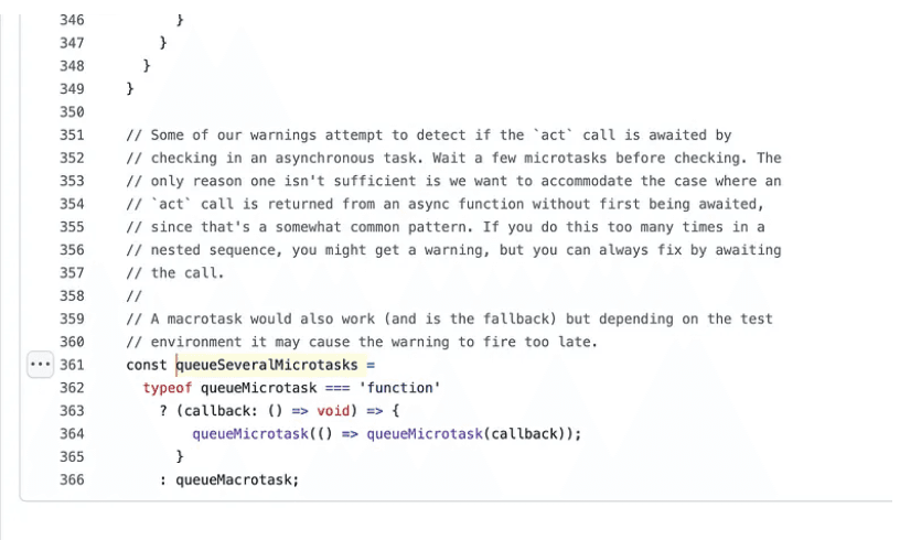 In this article, we analyze queueMicroTask function in React source codeReact uses queueMicroTask in a file named ReactAct.js. This is a public API, act. act is a test helper to apply pending React updates before making assertions. await act(async ac...