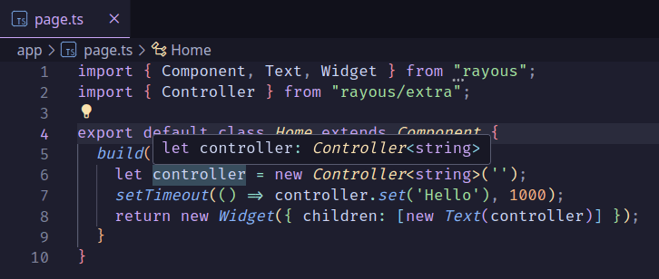 Rayous is a Component based, typescript frame that focuses on delivering a way to create ui without preprocessors, while still giving you the opportunity to use them. import { Component, Text } from "rayous"; export default class extends Component...