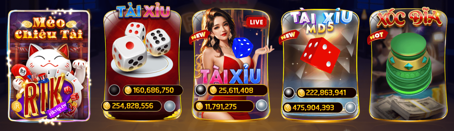 Rikvip là một trong những nhà cái trực tuyến nổi bật nhất hiện nay tại thị trường Việt Nam, chuyên cung cấp hàng loạt trò chơi cá cược hấp dẫn như tài xỉu, xóc đĩa, bầu cua, và hàng loạt các game bài phổ biến như Tiến lên miền Nam, Phỏm, Mậu binh, Po...