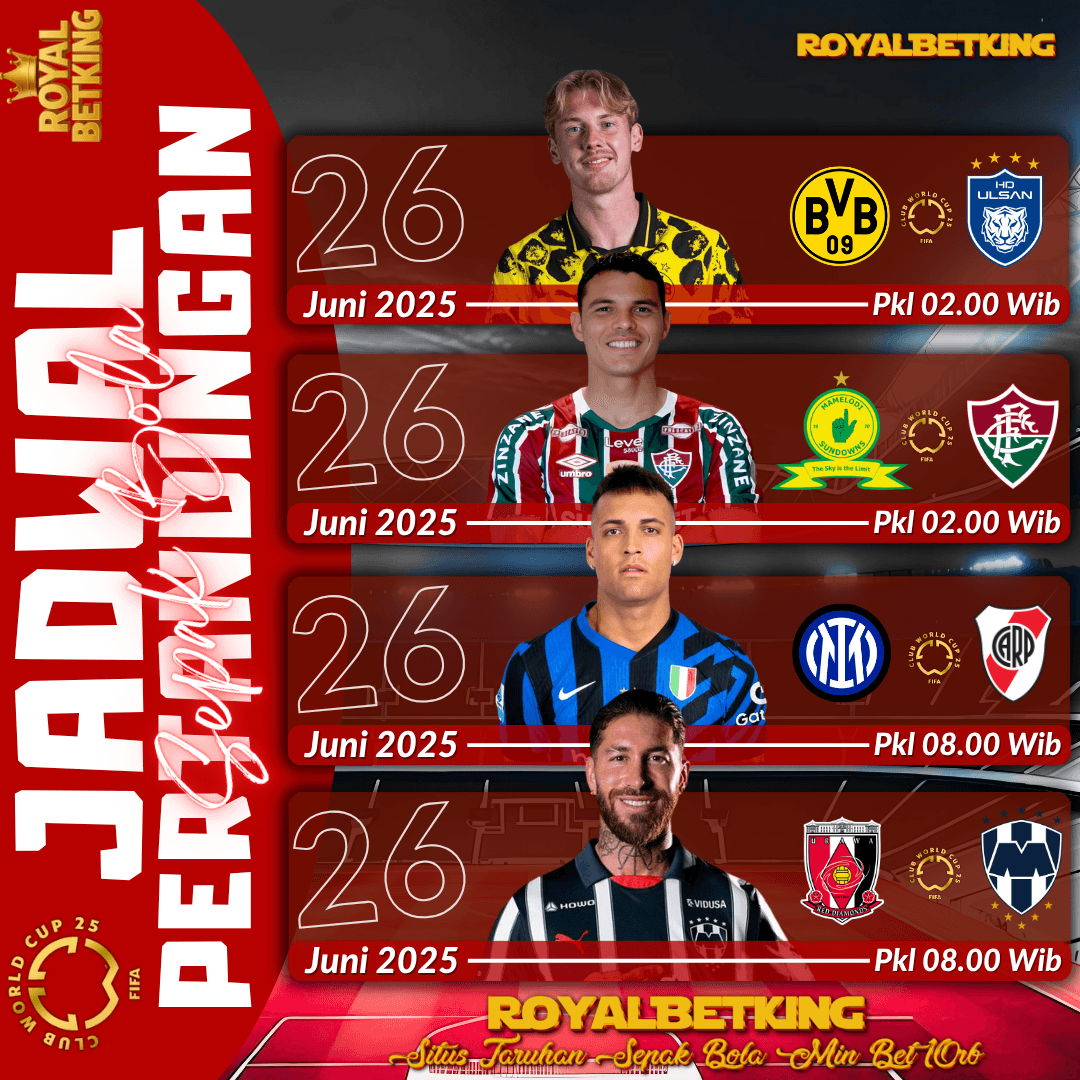 Daftarkan akun kamu untuk memasang taruhan bola yang sedang berlangsung sekarang yaitu PIALA DUNIA ANTARKLUB 2025 di Amerika. Royalbetking, situs taruhan bola yang menyediakan pasaran sepakbola terlengkap dengan odds terbesar. Royalbetking bekerja s...