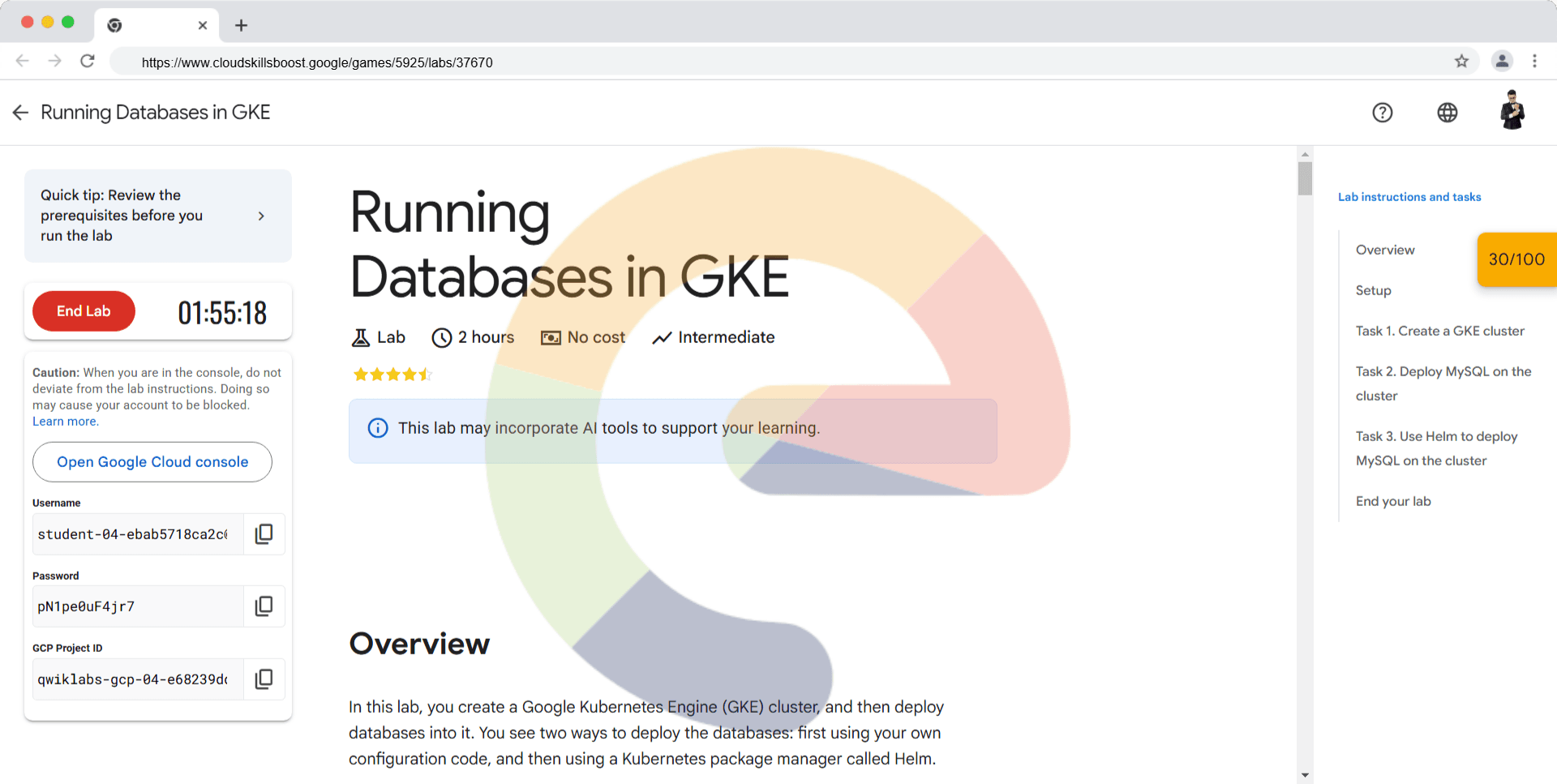 Overview In this lab, you create a Google Kubernetes Engine (GKE) cluster, and then deploy databases into it. You see two ways to deploy the databases: first using your own configuration code, and then using a Kubernetes package manager called Helm. ...