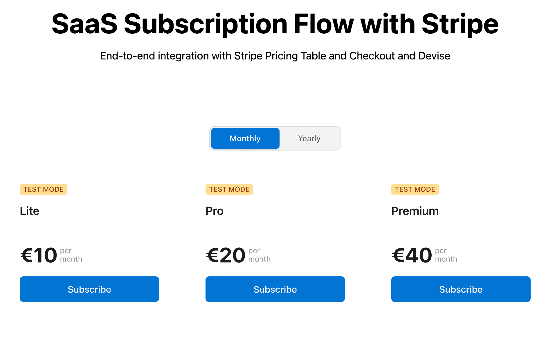 What we are going to build is a Stripe checkout integration for subscription flow of a SaaS app like this: So the idea of the sequence is: → User views landing page → user clicks on one of the plans on pricing table → user gets redirected to the Str...