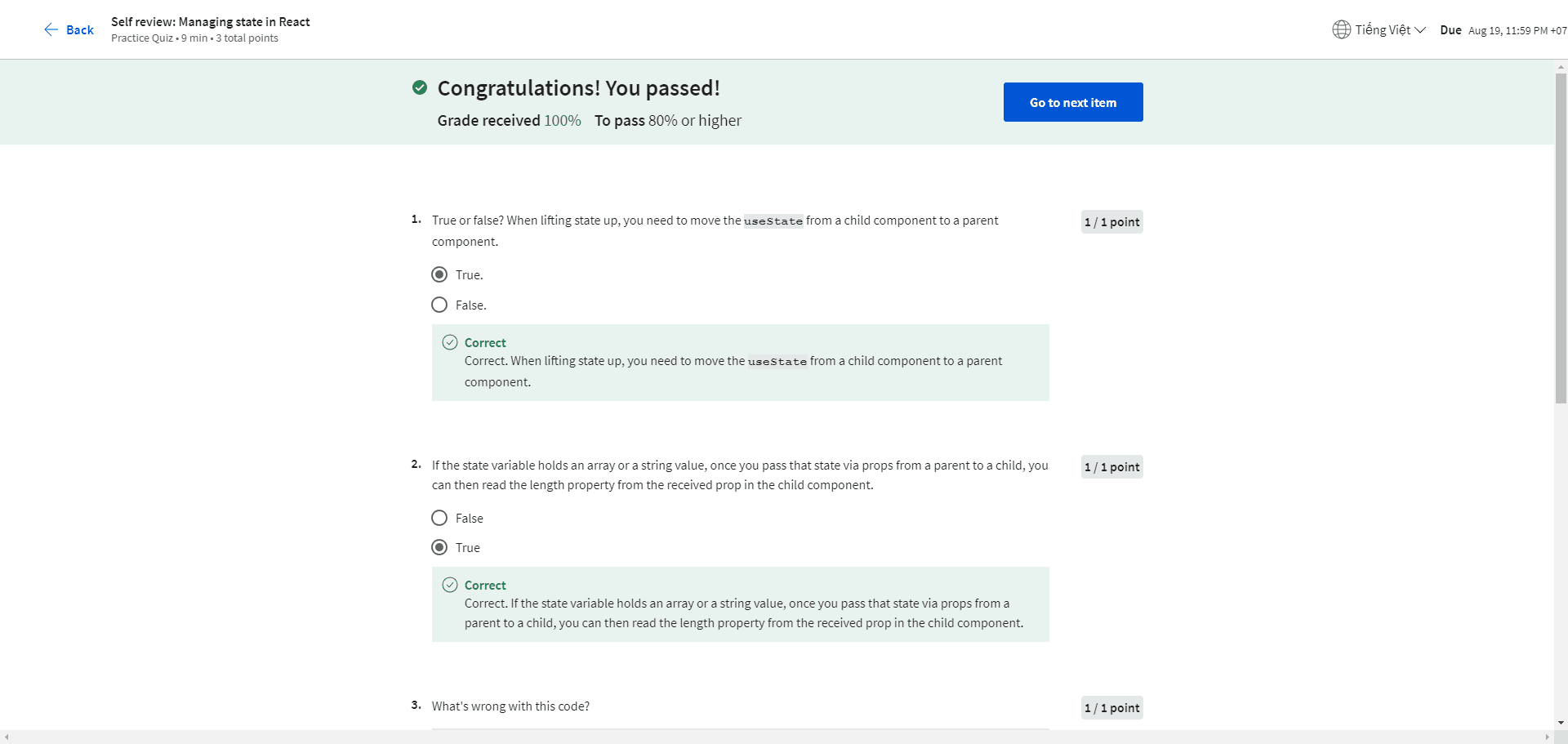 True or false? When lifting state up, you need to move the useState from a child component to a parent component. True. False. If the state variable holds an array or a string value, once you pass that state via props from a parent to a child, y...