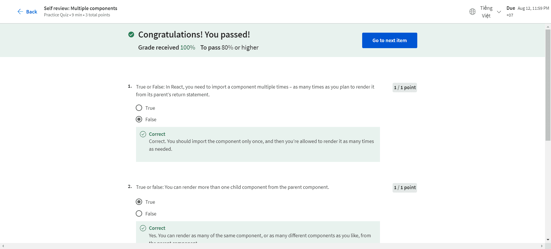 True or False: In React, you need to import a component multiple times – as many times as you plan to render it from its parent’s return statement. True False True or false: You can render more than one child component from the parent component....