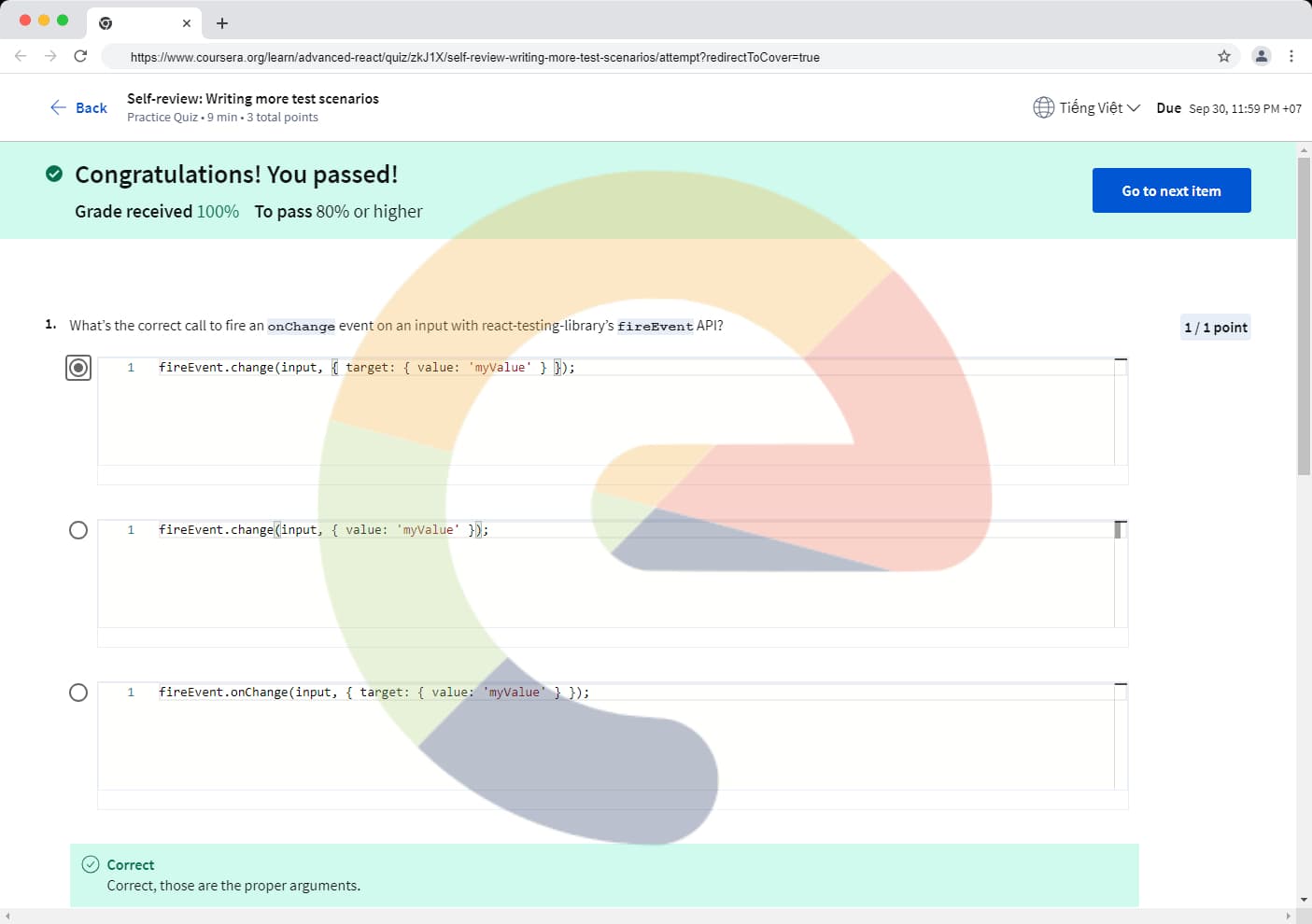 What’s the correct call to fire an onChange event on an input with react-testing-library’s fireEvent API? fireEvent.change(input, { target: { value: 'myValue' } }); fireEvent.change(input, { value: 'myValue' }); fireEvent.onChange(input, {...