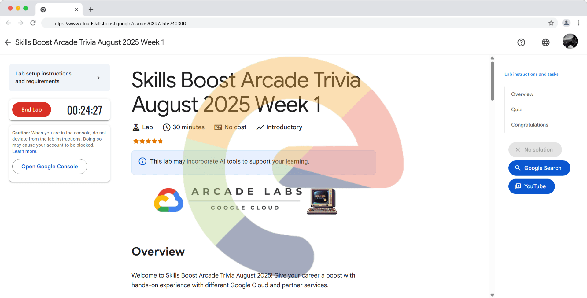 Overview Welcome to Skills Boost Arcade Trivia August 2025! Give your career a boost with hands-on experience with different Google Cloud and partner services. Click Start Lab to begin. P.S. You don't need the GCP Console for this, but you do need to...