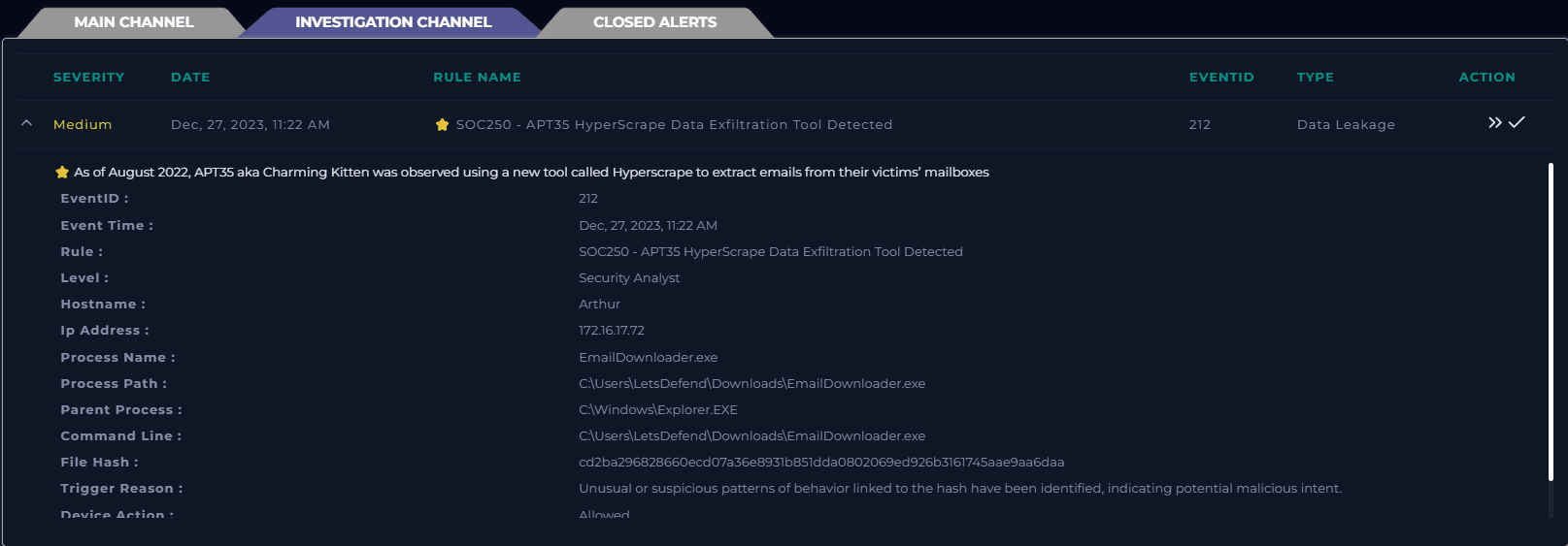In this case study, I investigated a high-severity alert from the LetsDefend platform: SOC250 – APT35 HyperScrape Data Exfiltration Tool Detected This alert simulates activity associated with APT35, a