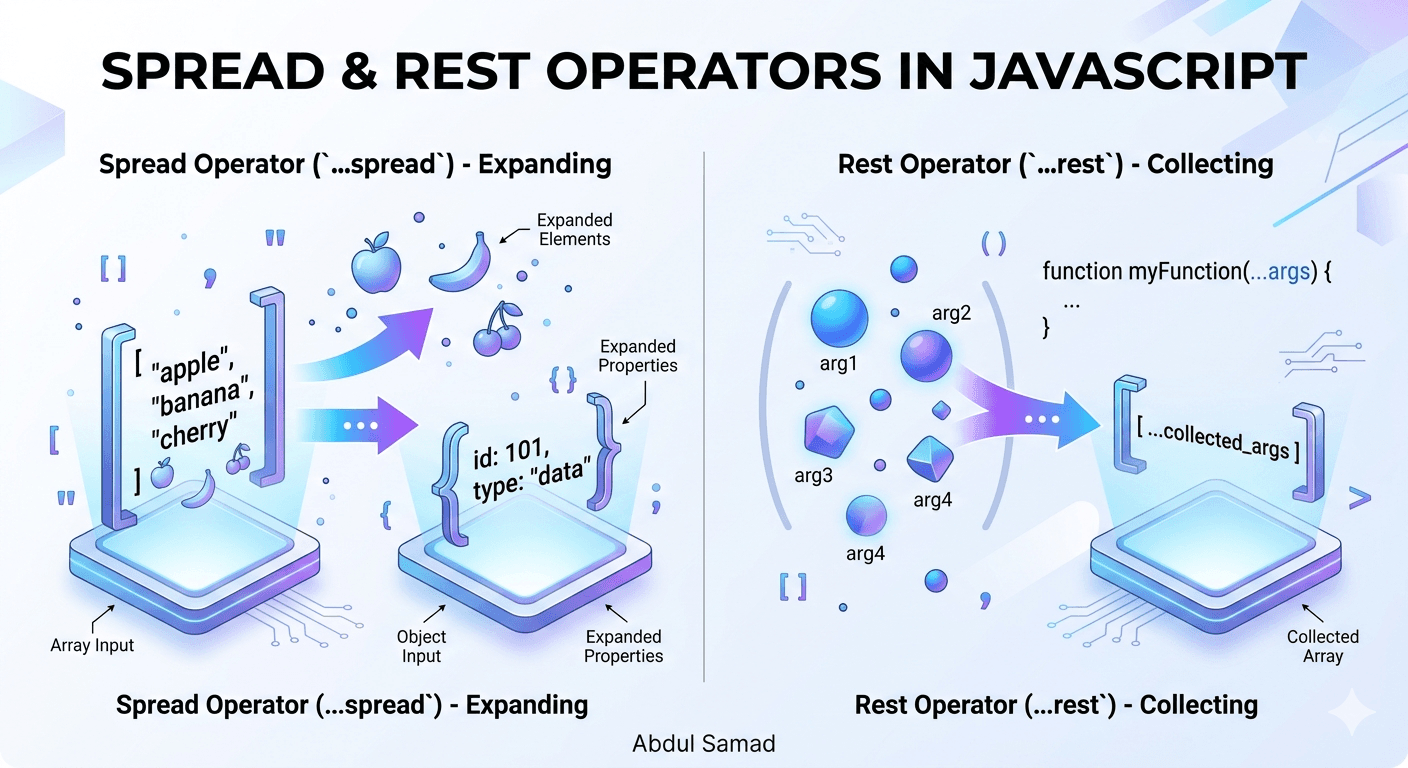 If you've spent any time reading modern JavaScript code, you've definitely seen ... floating around. Three little dots that somehow mean two completely different things depending on where you use them