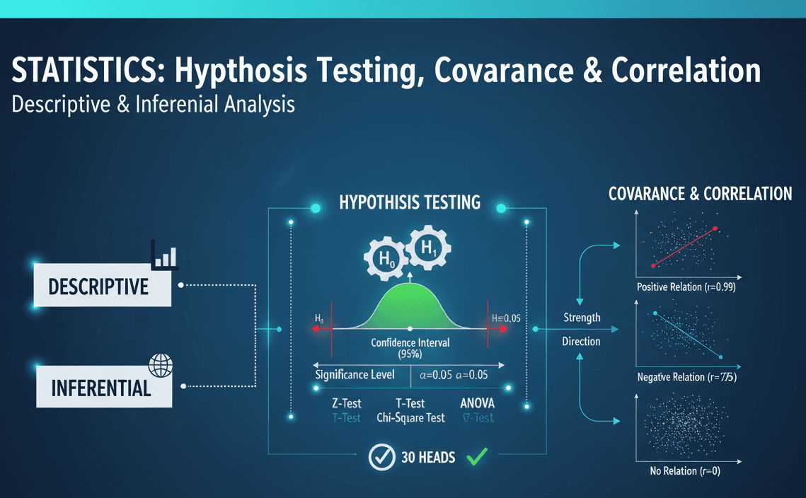 Descriptive and Inferential Statistics, Detailed note on Hyothesis Testing, Covariance and Correlation The two main types of Statistics: Descriptive Inferential - Descriptive and Inferential Statistics Descriptive Statistics describes or summar...