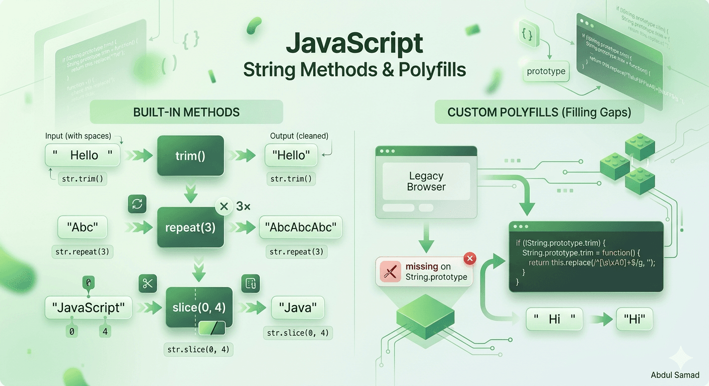 1. What String Methods Actually Are In JavaScript, a string isn't just text. It's a primitive value that gets temporarily wrapped in a String object whenever you call a method on it. That's why you ca