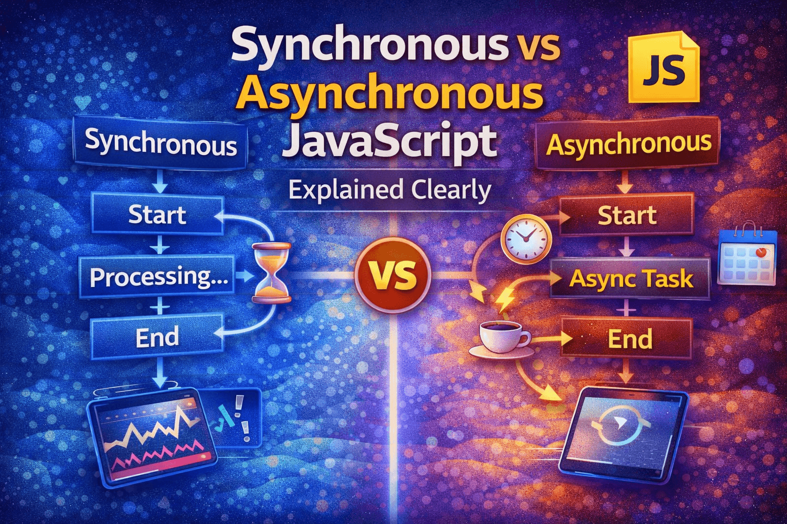 What is Synchronous Code? π Synchronous code runs line by line, one after another. Each task waits for the previous one to finish Execution is predictable and simple Example console.log("Start");