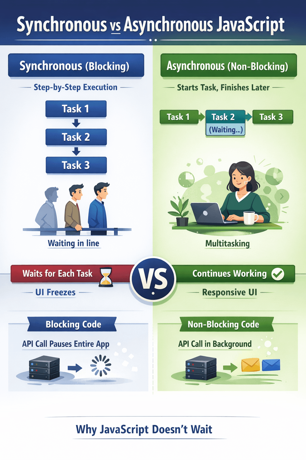 Understanding Blocking and Non-Blocking Code JavaScript can run code in two different ways: Synchronous Asynchronous If you understand this topic well, then concepts like: callbacks promises as