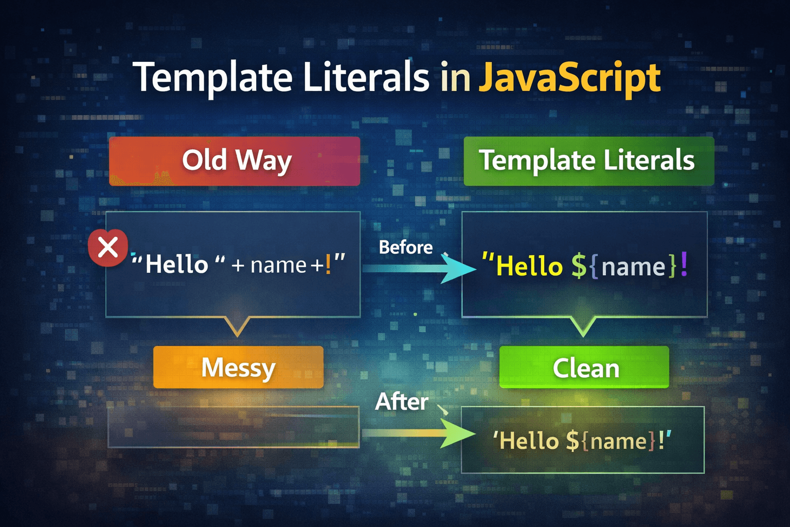 Introduction Handling strings is a very common task in JavaScript. But before ES6, working with strings was often messy and hard to read. Example (old way): const name = "Babita"; const age = 21; con